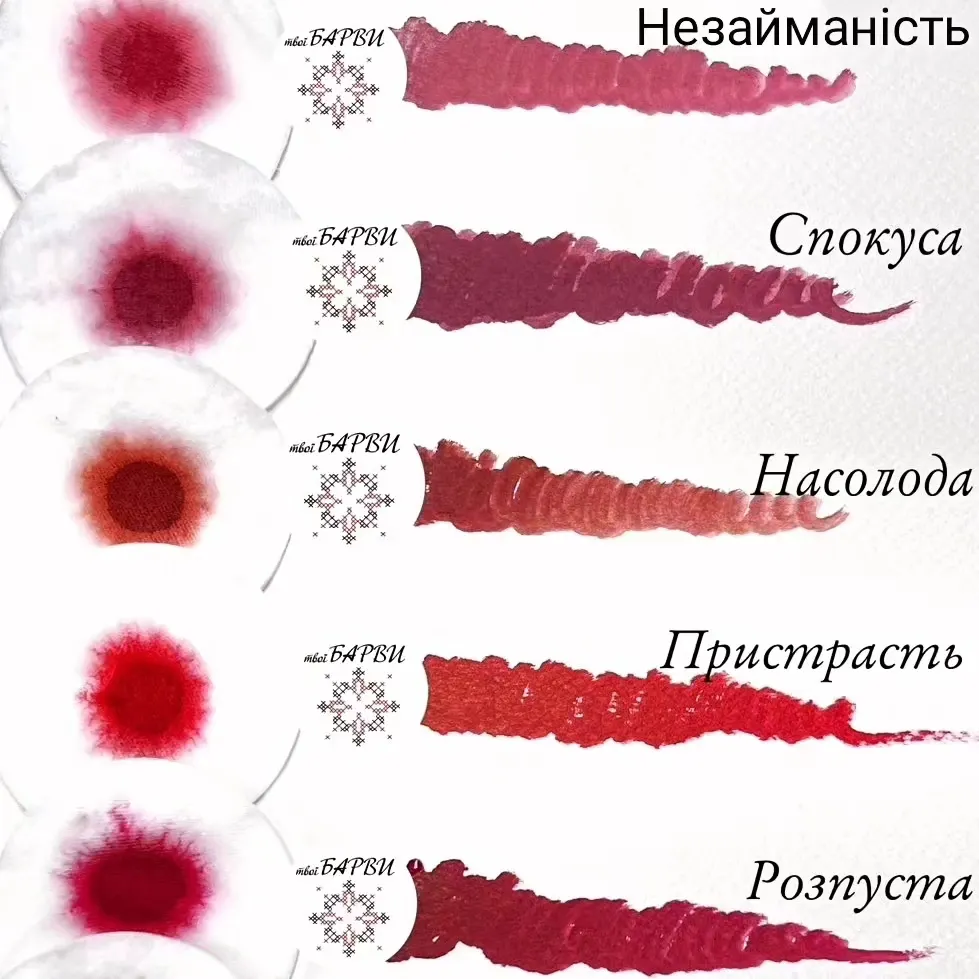 Розпуста спекотний колір молодого вина, який залишився на губах. Соковитий, плотний. Ти можешь використовувати його чистим, або додавати для затемнення до інших кольорів.